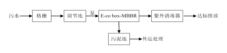 本項(xiàng)目污水來源主要為生活污水和收集的初期雨水。污水中污染物主要以有機(jī)物、氨氮、磷和懸浮物為主。結(jié)合相關(guān)工程實(shí)踐經(jīng)驗(yàn)和國(guó)內(nèi)同類工程的比較,針對(duì)該污水水質(zhì)、水量特點(diǎn),從工程的可靠性和設(shè)計(jì)的合理性出發(fā),本方案擬采用鵬凱箱“E-co box-MBR”一體化污水處理設(shè)備對(duì)該污水進(jìn)行處理。工藝流程如下所示: