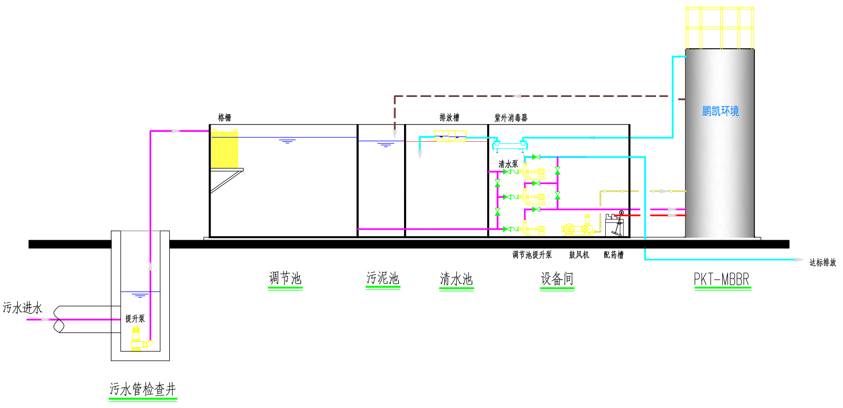 肇慶新區(qū)生態(tài)科技產(chǎn)業(yè)園區(qū)臨時污水處理工程是為滿足園區(qū)附近多個項目開工建設(shè)及投產(chǎn)需要而建設(shè)的一體化污水處理設(shè)施,對項目排出的污水統(tǒng)一進行處理后再排出到河涌。本工程采用了鵬凱環(huán)境自主研發(fā)倒置A2O+MBBR處理工藝,一體化污水處理工程項目總設(shè)計處理規(guī)模為500m3/d,可滿足約3000人日常生活污水的排放量。