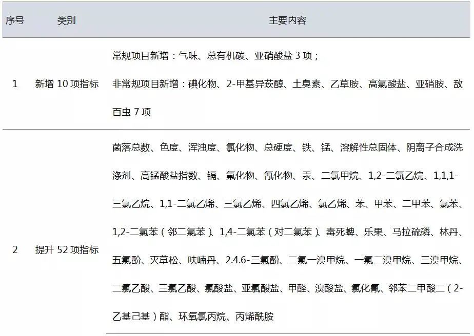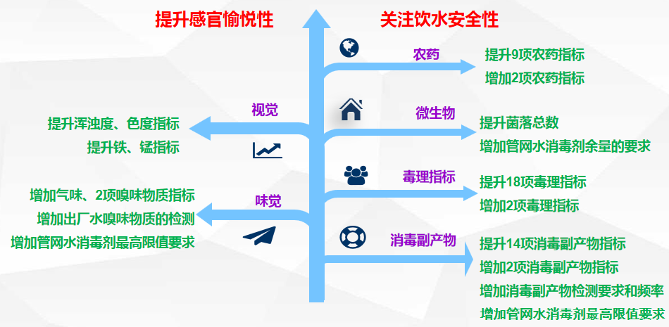 深圳市《生活飲用水水質(zhì)標準》與國家現(xiàn)行標準相比,增加了10項指標,提升了52項指標(含消毒劑);附錄由原來的28項增加到45項;考核方法上提升了出廠水和管網(wǎng)水合格率要求,增加了嗅味物質(zhì)和消毒副產(chǎn)物的檢測,重點關注龍頭水水質(zhì)。