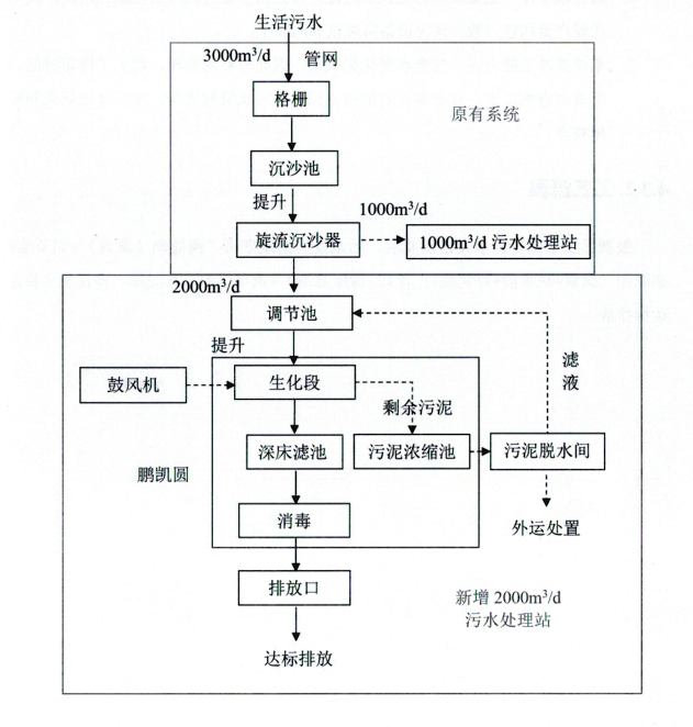 本工程附近現(xiàn)有一套1000噸/天污水處理廠,現(xiàn)需增加一套處理量為2000噸/天的污水處理廠,主要處理生活污水(附近管網(wǎng)污水+工廠宿舍污水,不含工業(yè)廢水)。根據(jù)污水水質(zhì)特性及出水要求,污水處理系統(tǒng)采用“預(yù)處理(原有)+調(diào)節(jié)池+鵬凱圓+消毒”的處理工藝,保證出水穩(wěn)定并達(dá)標(biāo)排放。項(xiàng)目出水CODcr、氨氮、總磷、石油類執(zhí)行《地表水環(huán)境質(zhì)量標(biāo)準(zhǔn)》(GB3838-2002)Ⅳ類標(biāo)準(zhǔn),其余指標(biāo)執(zhí)行《城鎮(zhèn)污水處理廠污染物排放標(biāo)準(zhǔn)》(GB18918-2002)中一級(jí)A標(biāo)準(zhǔn)達(dá)標(biāo)后就近排放。
