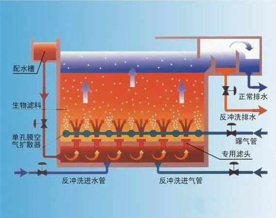 BAF工藝,也叫曝氣生物濾池,是集生物氧化和截留懸浮固體一體的新型生物膜法污水處理工藝,該工藝具有去除SS、COD、BOD、硝化、脫氮、除磷、去除AOX(有害物質(zhì))的作用。