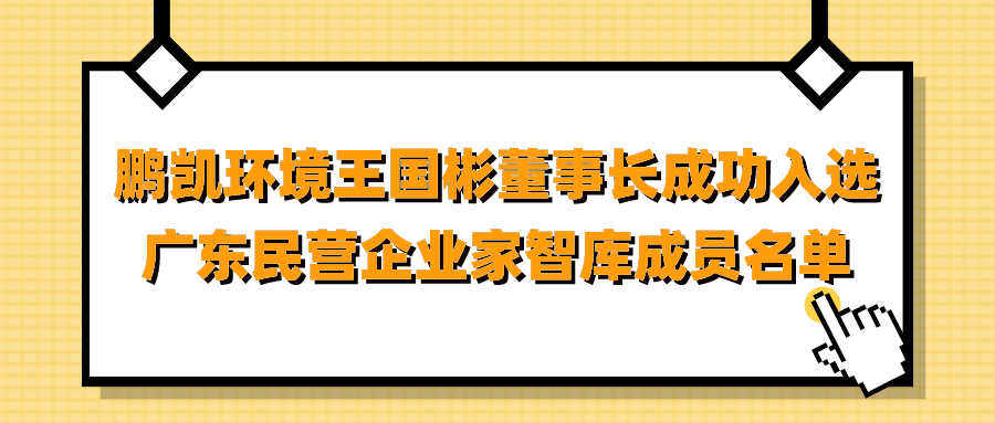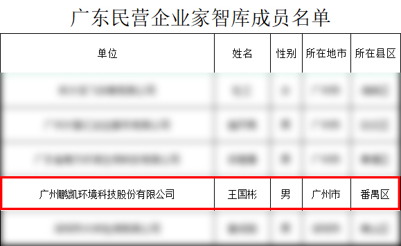 5月12日,廣東省工業(yè)和信息化廳發(fā)布《廣東省工業(yè)和信息化廳關(guān)于廣東民營企業(yè)家智庫成員名單的公示》,廣州鵬凱環(huán)境科技股份有限公司董事長王國彬成功入選廣東民營企業(yè)家智庫成員名單。