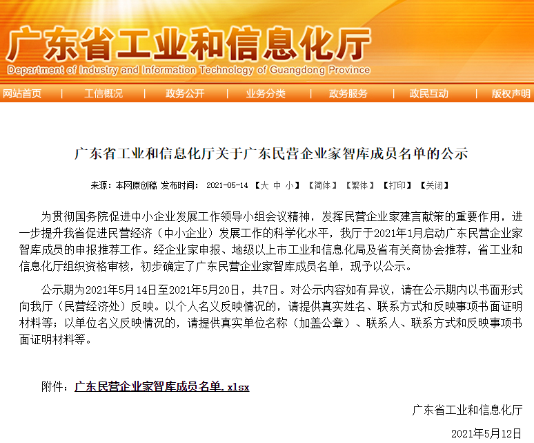 《廣東省工業(yè)和信息化廳關(guān)于廣東民營企業(yè)家智庫成員名單的公示》