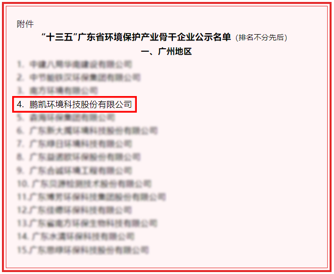 近日,“十三五”廣東省環(huán)境保護(hù)產(chǎn)業(yè)骨干企業(yè)評(píng)選結(jié)果公布,鵬凱環(huán)境憑借卓越的科技創(chuàng)新能力和強(qiáng)勁的綜合實(shí)力榮登“十三五”廣東省環(huán)境保護(hù)產(chǎn)業(yè)骨干企業(yè)榜單。