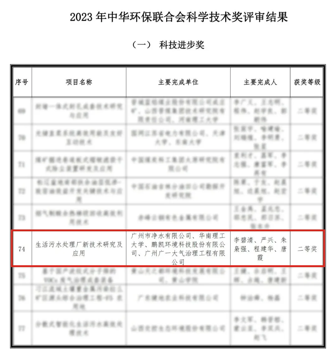 由廣州市凈水有限公司、華南理工大學(xué)、鵬凱環(huán)境科技股份有限公司、廣州廣一大氣治理工程有限公司四方強(qiáng)強(qiáng)聯(lián)合,通過(guò)深度合作完成的《生活污水處理廠新技術(shù)研究及應(yīng)用》項(xiàng)目,憑借其卓越的科技創(chuàng)新成果與顯著的實(shí)際應(yīng)用成效,榮獲“2023年中華環(huán)保聯(lián)合會(huì)科學(xué)技術(shù)獎(jiǎng)”科技進(jìn)步獎(jiǎng)二等獎(jiǎng)。獲此殊榮,不僅是對(duì)該項(xiàng)目的研究成果創(chuàng)新價(jià)值與實(shí)用價(jià)值的高度肯定,更是對(duì)鵬凱環(huán)境堅(jiān)持科技創(chuàng)新、勇攀環(huán)??萍几叻宓挠辛奈?。