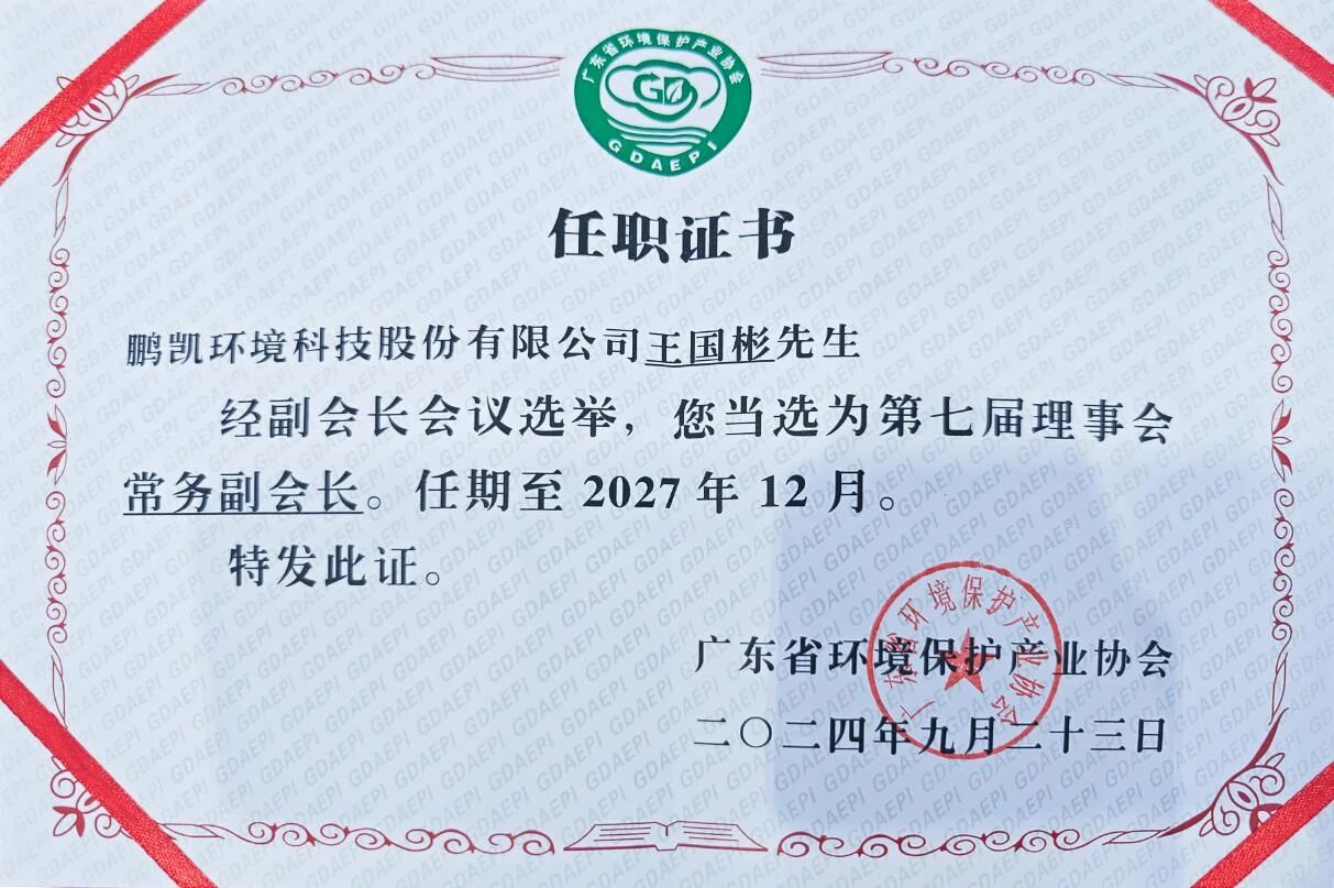 近日,鵬凱環(huán)境科技股份有限公司董事長(zhǎng)兼總裁王國(guó)彬先生,憑借其在環(huán)保領(lǐng)域的卓越貢獻(xiàn)和廣泛影響力,榮幸當(dāng)選為廣東省環(huán)境保護(hù)產(chǎn)業(yè)協(xié)會(huì)第七屆理事會(huì)常務(wù)副會(huì)長(zhǎng)。這一任命不僅是對(duì)王國(guó)彬先生個(gè)人能力和領(lǐng)導(dǎo)力的認(rèn)可,更是對(duì)鵬凱環(huán)境在環(huán)保產(chǎn)業(yè)中持續(xù)創(chuàng)新與發(fā)展的高度肯定。